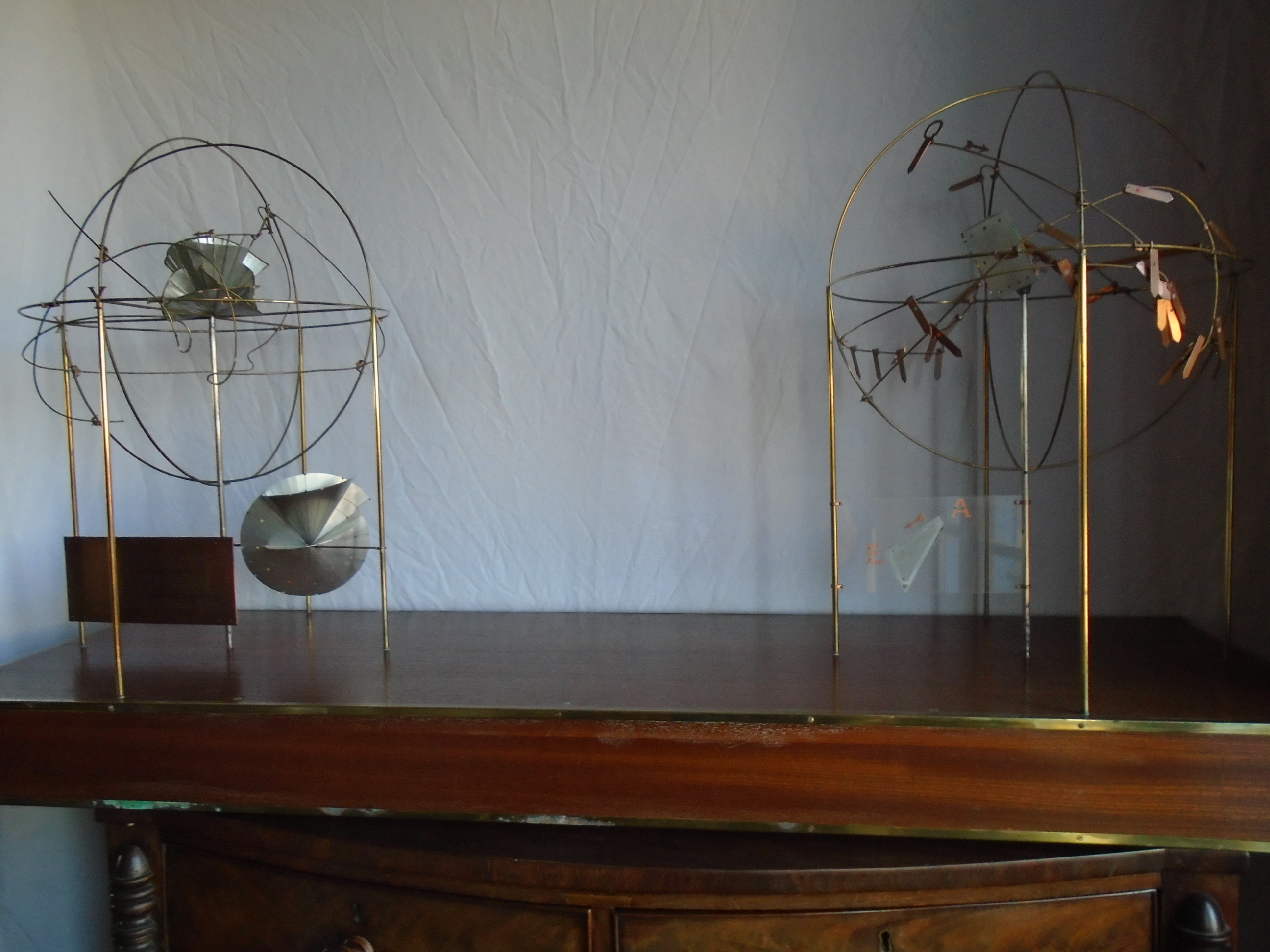 Etched on the copper plate at bottom left of the model is an explanation of it: “The Wriggling Steel Rod – the original intention was to transform the triangular-section rod on the upper far right of the model into the shape on the near right. Or, more precisely, as much of the surface of the rod into as similar a configuration to that on the near right as possible. What has been achieved is the transformation of that portion of the rod’s surface shown on the lower far right, into the configuration above. The reason for the fact that less than half of the rod’s surface has been transformed (lower far right) is that only two planes passing through the centre of the sphere can be simultaneously transformed and perceived, using intersecting circles – one for each plane – of possible positions of the eye. If this appears a long way from the original intention, it must be argued that the above shape resembles the one on the near right considerably more than either of them resemble the triangular-section steel rod”.